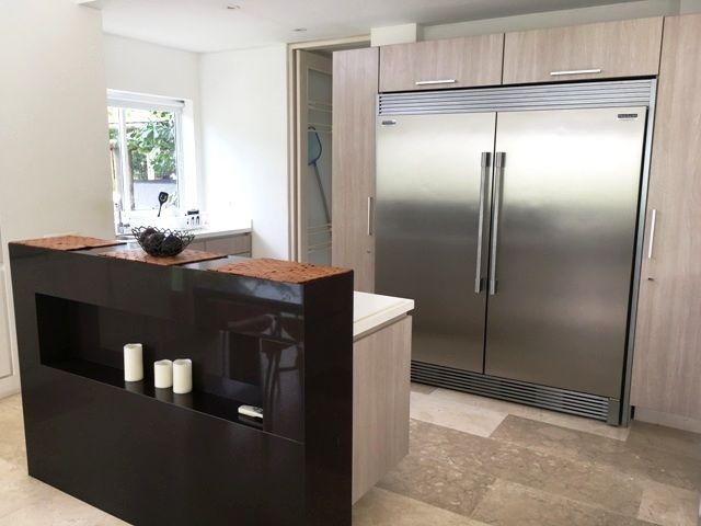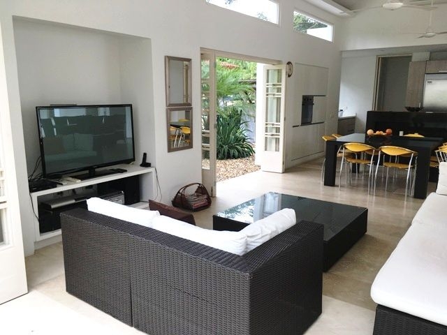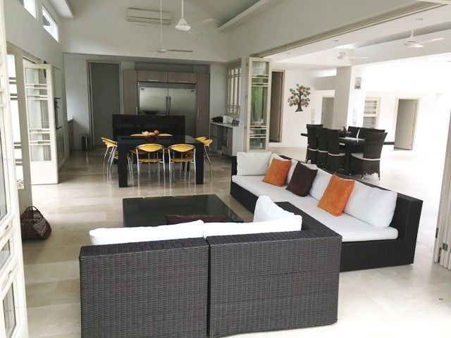 Sala de televisión, Comedor en madera de 8 puestos y Cocina amplia con estufa en el centro, totalmente dotada y equipada junto con mesón y barra con vista a la piscina, esta zona cuenta con ventiladores y aire, con puertas tipo acordeón en madera y vidrio