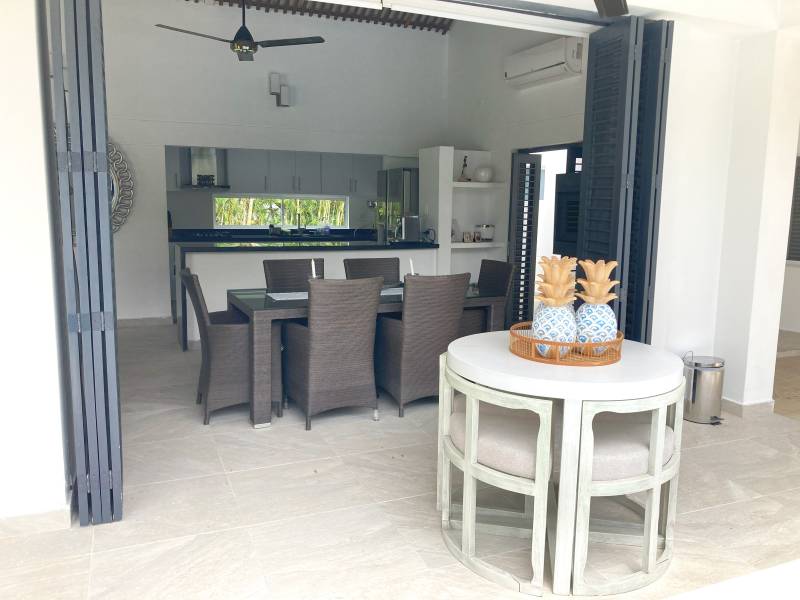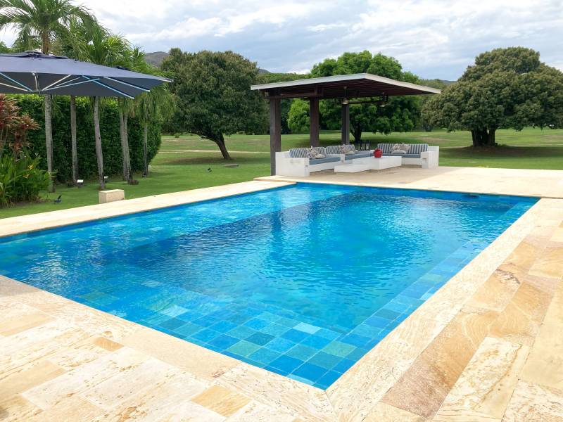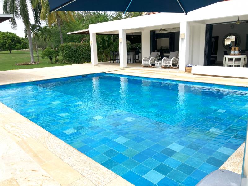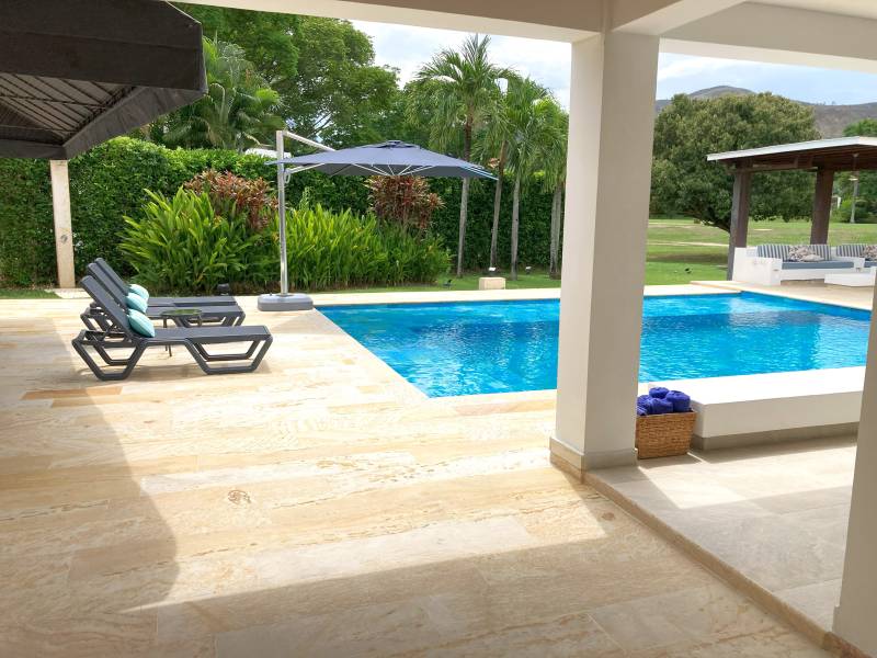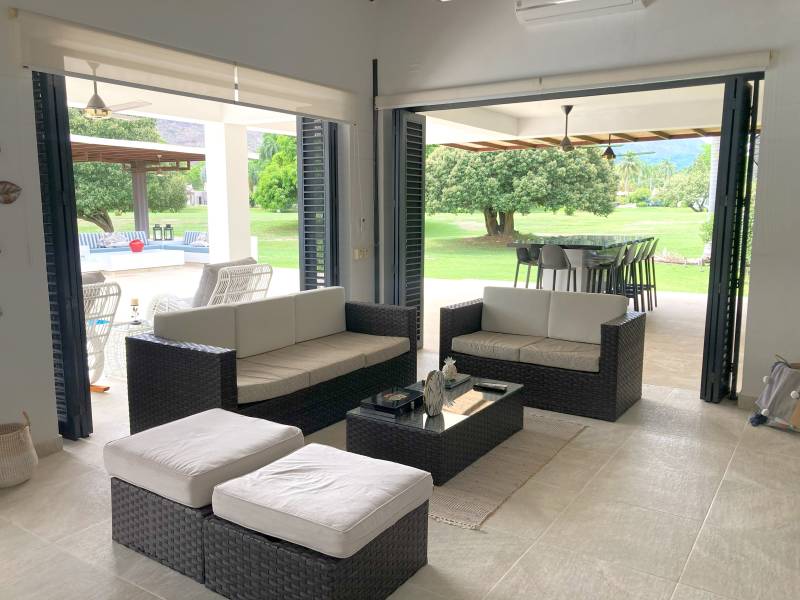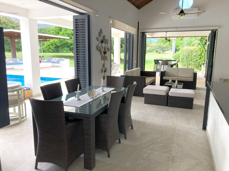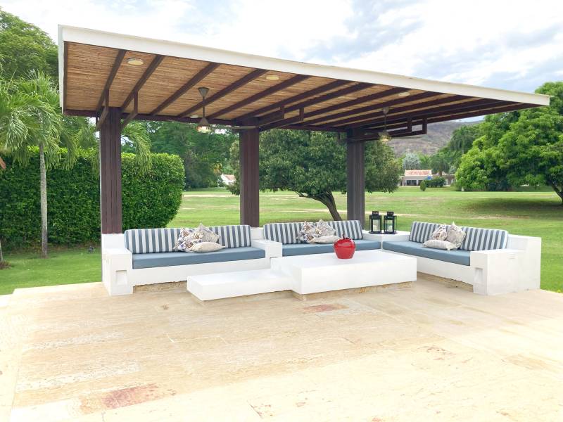 Sala exterior en mamposteria cubierta por pergola, con vista a la piscina y al campo de golf.