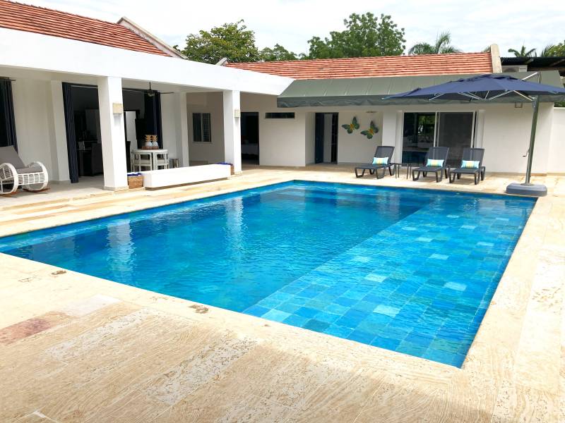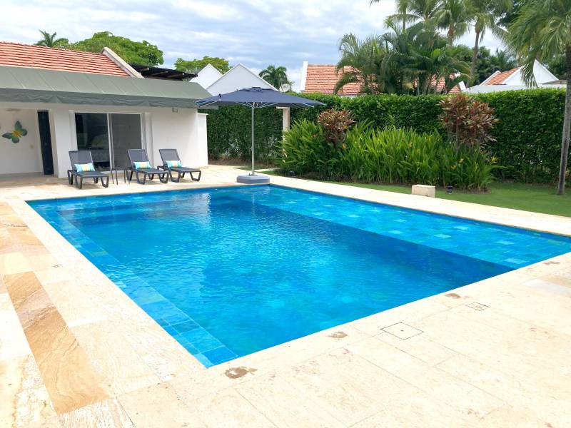 Piscina acompañada de asoleadoras y parasol.