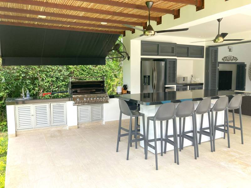 Zona de Bbq cubierta, totalmente equipada y dotada, junto con meson comedor de 10 puestos.